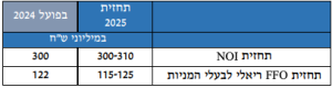 - ה-FFO ברבעון השלישי הסתכם לכ-29.7 מיליון ש"ח לעומת כ-30.1 מיליון ש"ח ברבעון המקביל אשתקד, קיטון של כ-1.3% הקיטון נבע בעיקר מירידה בשערי החליפין הממוצעים ומהעלייה בהוצאות המימון.